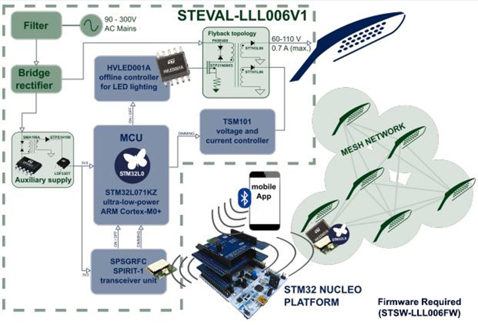 搭配的完整程式包STSW-LLL006FW固件演示了基于6LoWPAN無線網(wǎng)狀網(wǎng)絡技術的智能城市場景中的街道照明控制,該技術可從單個智能設備實現(xiàn)遠程調光和整個街道照明網(wǎng)絡的開/關控制。