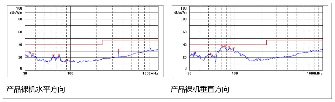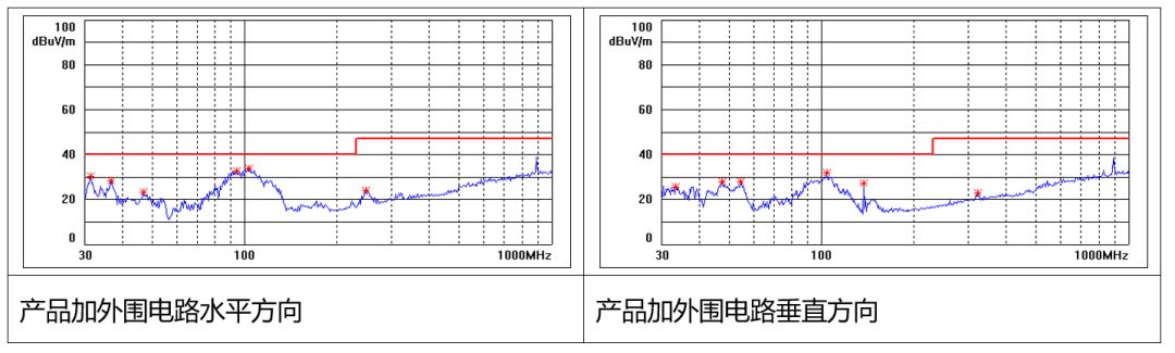 P0505FKS-1W裸機(jī)、加外圍電路等不同情況下測(cè)試輻射結(jié)果如圖4和圖5所示。