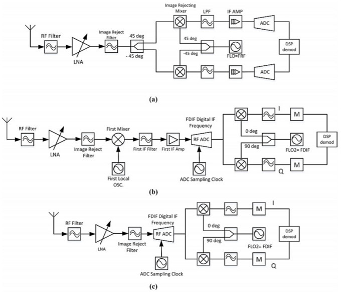 圖 2 展示了采樣接收器的三種不同架構(gòu):a) 基帶、b) IF 和 c) RF。RF 模數(shù)轉(zhuǎn)換器 (ADC) 將根據(jù)輸入頻率決定選用的接收器類型(a、b 或 c)。