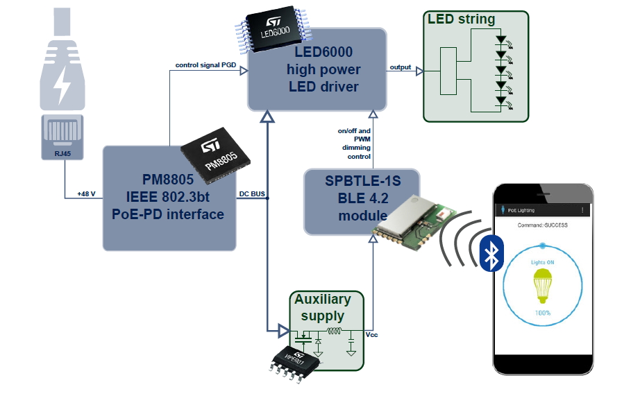 STEVAL–POEL45W1以太網(wǎng)供電(PoE)供電的LED驅(qū)動(dòng)器設(shè)計(jì)提供45 W的功率輸出,并使LED調(diào)暗至最大亮度的1%,而沒(méi)有任何閃爍。 該解決方案通過(guò)PoE_Lighting Android應(yīng)用程序(在Google Play上提供)支持通過(guò)藍(lán)牙進(jìn)行的遠(yuǎn)程調(diào)光控制。LED驅(qū)動(dòng)器的電源能夠在37V至57V輸入直流電壓下工作,最大輸出功率為45W。具有數(shù)位/ PWM調(diào)光功能,PWM調(diào)光深度接近1%。 。通過(guò)Android應(yīng)用程序控制LED的智能調(diào)光和開(kāi)/關(guān)。待機(jī)功耗(空載)消耗符合EnergyStar和EU Ecodesign標(biāo)準(zhǔn)設(shè)定的能源目標(biāo)。在大多數(shù)輸入電壓范圍內(nèi),轉(zhuǎn)換器效率達(dá)到95%。開(kāi)發(fā)的解決方案具有所有保護(hù)功能,例如LED開(kāi)路和短路。尺寸緊湊,以適應(yīng)現(xiàn)有的市售LED!