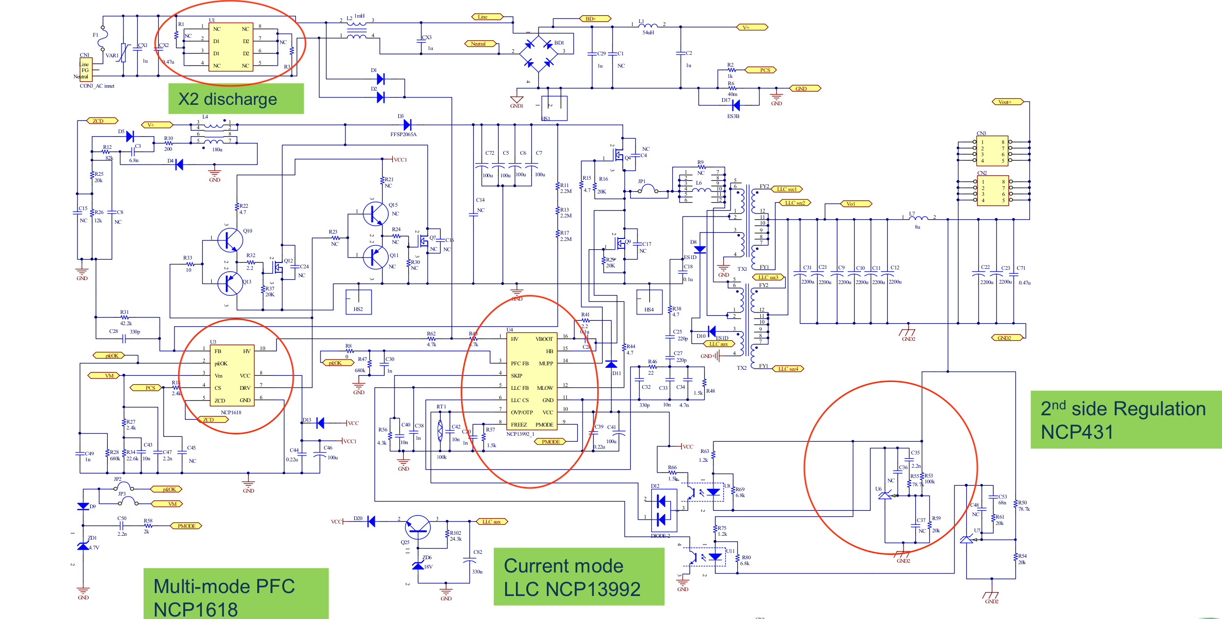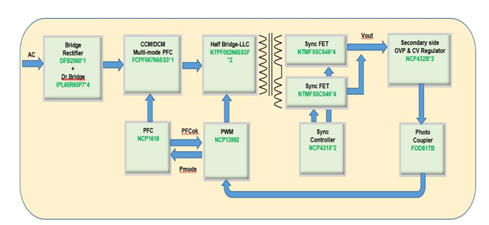 500W的方案使用NCP1618和NCP13992搭配NCP4318同步整流的的的半橋設(shè)計(jì)方案, NCP1618可以提供多種工作模式,在Tcycle小于Tclamp 工作頻率時(shí),線路工作在DCM的工作狀態(tài),在Tclamp 大于 Tcycle 小于 TCCM工作頻率是,線路工作在CRM工作模式,在Tcycle 大于120%*TCCM 工作頻率時(shí),線路工作在CCM工作模式,此工作模式可以更好的優(yōu)化線路架構(gòu)以及功耗等問題,在輕載待機(jī)方面比上一代NCP1616產(chǎn)品提升30MW, 同步在滿載效率有提升2% 。NCP13992是電流模式的LLC方案,電流模式控制,不需要額外的過載和短路響應(yīng)系統(tǒng),有更快的穩(wěn)定響應(yīng),實(shí)現(xiàn)600V的門級(jí)控制,不需要輔助供電線路簡(jiǎn)化線路,更高的效率和更低的輕載能耗,同時(shí)NCP13992可以半數(shù)位控制,輕松實(shí)現(xiàn)過載保護(hù),硬開關(guān)電流保護(hù),死區(qū)調(diào)整,過壓和過流等的保護(hù)。NCP4318是SR控制器,可以實(shí)現(xiàn)2路驅(qū)動(dòng)控制,極大的優(yōu)化線路和設(shè)計(jì)難度,獨(dú)特的關(guān)斷控制算法,可以極大的提高整個(gè)產(chǎn)品的效率。