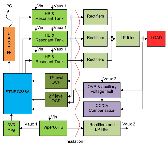 交錯的拓?fù)浣Y(jié)構(gòu)通過3個并行級來平衡功率。 此外,該解決方案通過根據(jù)負(fù)載啟用一,二或三級來在整個負(fù)載范圍內(nèi)提供高效率。STNRG388A功率轉(zhuǎn)換專用外設(shè)狀態(tài)機(jī)事件驅(qū)動(State Machine Event Driven,SMED)提供了驅(qū)動交錯功率級的靈活性,同時確保了在啟動和停止每個級時正確的相位重新對準(zhǔn)。借助STNRG388A的數(shù)位內(nèi)核,還可以通過方便的超級終端控制來監(jiān)視,控制和調(diào)試EVLSTRNG-1KW板。