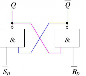 基本RS觸發(fā)器可以由兩個(gè)與非門按正反饋方式閉合構(gòu)成。通常將Q端的狀態(tài)定義為鎖存器的狀態(tài),即Q=1時(shí),稱為鎖存器處于1的狀態(tài);Q=0時(shí),稱鎖存器處于0的狀態(tài),電路具有兩個(gè)穩(wěn)態(tài)。電路要改變狀態(tài)必須加入觸發(fā)信號(hào),因是與非門構(gòu)成的基本RS觸發(fā)器,所以,觸發(fā)信號(hào)是低電平有效。非Rd和非Sd是一次信號(hào),只能一個(gè)個(gè)加,即它們不能同時(shí)為低電平,因?yàn)闀?huì)有邏輯矛盾(Q == 非Q)。