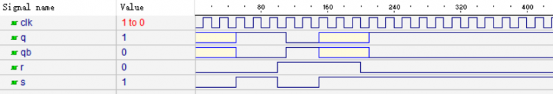 `timescale1ns/100ps//仿真時(shí)間單位/時(shí)間精度 modulers_ff_tb(); regclk,r,s; //需要產(chǎn)生的激勵(lì)信號(hào)定義 wireq,qb; //需要觀察的輸出信號(hào)定義 //初始化過程塊 initial begin clk=0; r=0; s=0; #50 r=0; s=1; #50 r=1; s=0; #50 r=1; s=1; #50 r=0; s=1; end always#10clk=~clk;//產(chǎn)生輸入clk,頻率50MHz //module調(diào)用例化格式 rs_ffu1(//rs_ff表示所要例化的module名稱,u1是我們定義的例化名稱 .clk(clk),//輸入輸出信號(hào)連接。 .r(r), .s(s), .q(q),//輸出信號(hào)連接 .qb(qb) ); endmodule