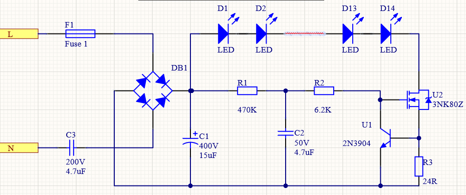 為了達到無頻閃的要求,我們選取了最合適的電解電容400V 15uF,算下來相當(dāng)于每瓦兩微法。電容和電感一樣有三種工作模式,分別是斷續(xù)、臨界、連續(xù),電容斷續(xù)模式會導(dǎo)致燈具頻閃,而臨界和連續(xù)就沒有頻閃,所以要盡量工作于連續(xù)模式。LED線性驅(qū)動的最大優(yōu)勢在于其成本低,后續(xù)的升級版本我們會將MOS管改成三極管13001,成本只需幾分錢,請大家拭目以待!