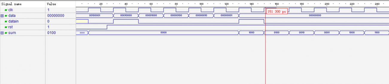 仿真文件的串行輸入數(shù)據(jù)也是靠串行轉(zhuǎn)并行移位寄存器輸入,所以累加器計(jì)算的時(shí)鐘要順延8個(gè)clock得到結(jié)果??梢孕薷姆抡嫖募械拇休斎霐?shù)據(jù)初值驗(yàn)證累加器結(jié)果。