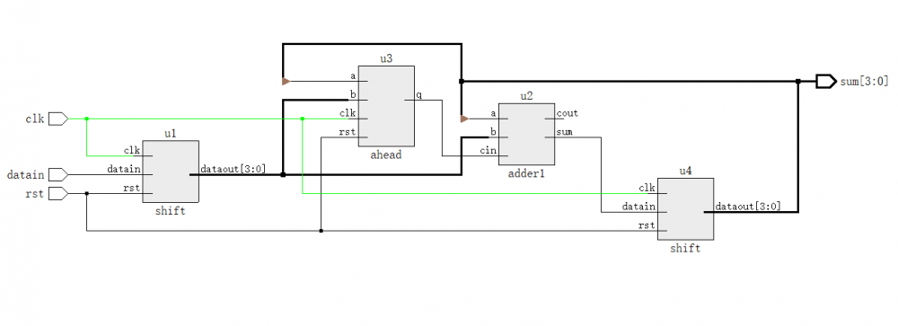 moduleaccum4 ( inputwiredatain,//數(shù)據(jù)輸入 inputwireclk,rst,//脈沖和復(fù)位輸入信號(hào) outputwire[3:0]sum//累加結(jié)果 ); wire[3:0]adder;//寄存器1,存儲(chǔ)輸入加數(shù)內(nèi)容 wire[3:0]sumer;//寄存器2,存儲(chǔ)被加數(shù)內(nèi)容 wirecin;//全加器超前進(jìn)位信號(hào) wiresumout;//全加器輸出 assignsum=sumer;//累加結(jié)果輸出 shiftu1//移位寄存器,把數(shù)據(jù)存入加數(shù)寄存器 ( .clk(clk), .rst(rst), .datain(datain), .dataout(adder) ); adder1u2//全加器,兩個(gè)寄存器的最低位相加,進(jìn)位由超前進(jìn)位邏輯輸出 ( .a(sumer[0]), .b(adder[0]), .cin(cin),.sum(sumout), .cout());aheadu3//超前進(jìn)位邏輯,產(chǎn)生進(jìn)位信號(hào) ( .a(sumer[0]),.b(adder[0]),.clk(clk),.rst(rst), .q(cin) ); shiftu4//移位寄存器,將全加器結(jié)果存入被加數(shù)寄存器 ( .clk(clk), .rst(rst), .datain(sumout), .dataout(sumer) ); endmodule