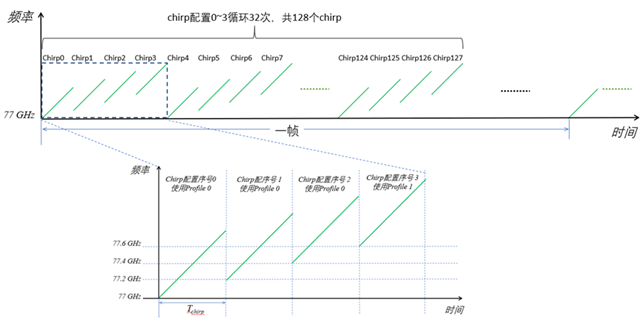 下面舉例說明如何在AWR1843上配置一個(gè)frame波形。假設(shè)配置4個(gè)不同的chirp配置,每個(gè)chirp配置的起始頻率增加200MHz,按照chirp 0~chipr 3的配置循環(huán)發(fā)波,一個(gè)frame里共128個(gè)chirp,一直發(fā)波。波形配置和波形示意圖如下。