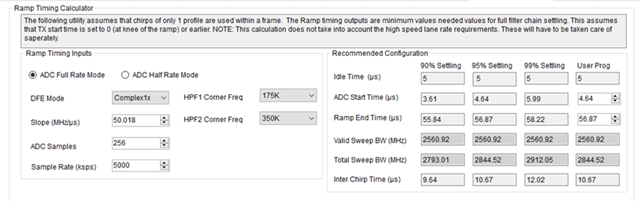 mmwave studio里有一個(gè)Ramp Timing Caculator工具,可以根據(jù)用戶設(shè)定,給出建議的idle time和adc start time。如果使用的帶寬超出芯片支持的范圍,也會(huì)給出提示。