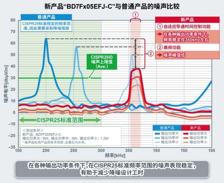通過(guò)采用ROHM所擅長(zhǎng)的模擬設(shè)計(jì)技術(shù),在檢測(cè)二次側(cè)的電壓和電流方面,新產(chǎn)品無(wú)需以往產(chǎn)品所需的光電耦合器*3或變壓器的輔助繞組以及外圍部件。由此,可以在改善光電耦合器的課題如檢測(cè)精度受功耗大小和溫度的影響,年久老化等的同時(shí),減少元器件數(shù)量,實(shí)現(xiàn)產(chǎn)品的小型化。因此,與普通的反激式隔離電源的電路相比,可以削減光電耦合器和用于檢測(cè)電流的外圍元器件等10個(gè)部件,體現(xiàn)在電路板面積上時(shí),能夠削減30%左右的面積。此外,由于新產(chǎn)品配備了自適應(yīng)導(dǎo)通時(shí)間控制功能,可以固定開(kāi)關(guān)導(dǎo)通時(shí)間,所以無(wú)論是在哪種輸出功率狀態(tài)下,開(kāi)關(guān)頻率都能穩(wěn)定在350kHz左右。通常,在應(yīng)對(duì)汽車電子電磁兼容EMC標(biāo)準(zhǔn)CISPR25*4時(shí),往往需要針對(duì)150kHz~300kHz頻段采取降噪措施,而此次開(kāi)發(fā)出的新產(chǎn)品因?yàn)闆](méi)有涉及到該頻段范圍,所以應(yīng)用產(chǎn)品的降噪工作將更加輕松。這些優(yōu)勢(shì)再加上有助于降低輻射噪聲的展頻功能*5,可進(jìn)一步減少降噪相關(guān)的設(shè)計(jì)工時(shí)。