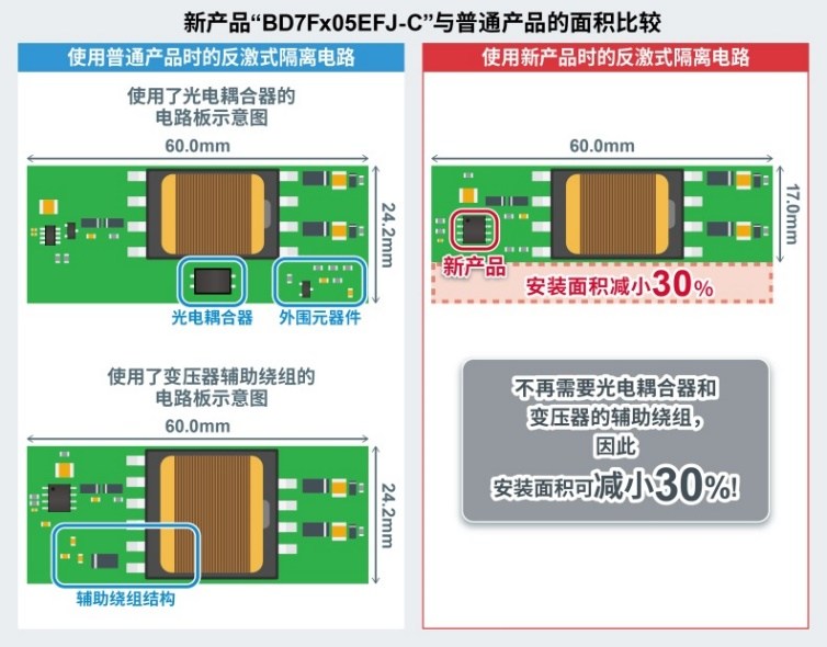 與普通產(chǎn)品相比,在主驅(qū)逆變器、OBC等的隔離電路中,安裝面積可減少約30%