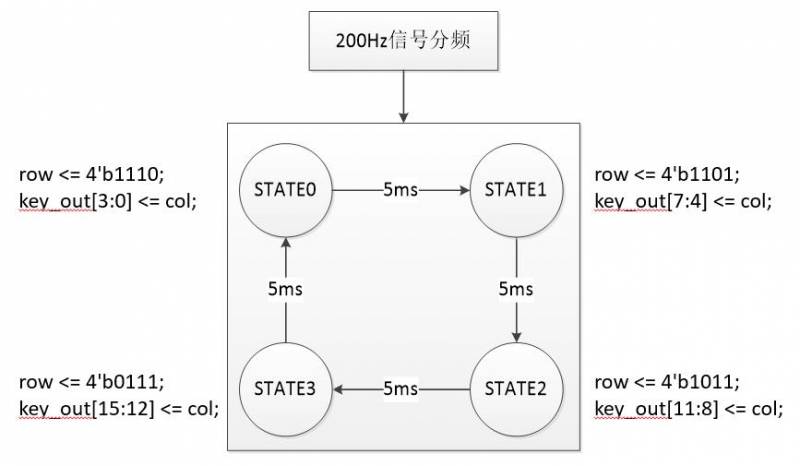 通過上面的描述:在這一時刻只有K1、K2、K3、K4按鍵被按下,才會導(dǎo)致4根列線輸出COL1=0、COL2=0、COL3=0、COL4=0,否則COL1=1、COL2=1、COL3=1、COL4=1,反之當(dāng)FPGA檢測到列線(COL1、COL2、COL3、COL4)中有低電平信號時,對應(yīng)的K1、K2、K3、K4按鍵應(yīng)該是被按下了。