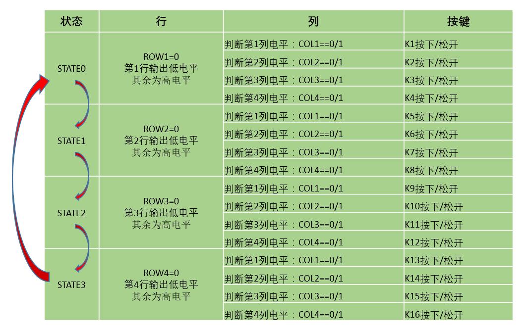上圖為4×4矩陣按鍵的硬件電路圖,可以看到4根行線(ROW1、ROW2、ROW3、ROW4)和4根列線(COL1、COL2、COL3、COL4),同時列線通過上拉電阻連接到VCC電壓(3.3V),對于矩陣按鍵來講: