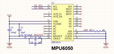 姿態(tài)傳感器選用了Invensense的MPU6050,是一個I2C接口的9軸運動處理傳感器,集成了3軸陀螺儀和3軸加速度計,以及一個可擴展的數(shù)字運動處理器,廣泛應(yīng)用在機器人,無人機,平衡車等產(chǎn)品中。