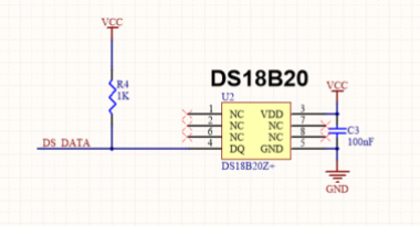 溫度傳感器選用了Dallas半導(dǎo)體的DS18B20Z,是一個單總線、12位進度的數(shù)字式溫度傳感器,輸入電壓為3.0V~5.5V,比較靈活,工作溫度可在-55攝氏度~125攝氏度之間,可滿足我們?nèi)粘J褂玫男枨?,DS18B20有直插和SOIC貼片兩個封裝,這里選用8pin SOIC。