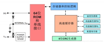 DS18B20測(cè)量溫度范圍為-55~+125℃,精度為±0.5℃?,F(xiàn)場(chǎng)(實(shí)時(shí))溫度直接以“單總線” 的數(shù)字方式傳輸,大大提高了系統(tǒng)的抗干擾性。它能直接讀出被測(cè)溫度,并且可根據(jù)實(shí)際要求通過簡(jiǎn)單的編程實(shí)現(xiàn)9~l2位的數(shù)字值讀數(shù)方式。它工作在3~5.5V的電壓范圍,采用多種封裝形式,從而使系統(tǒng)設(shè)計(jì)靈活、方便,設(shè)定分辨率及用戶設(shè)定的報(bào)警溫度存儲(chǔ)在EEPROM中,掉電后 依然保存。其內(nèi)部結(jié)構(gòu)如圖: