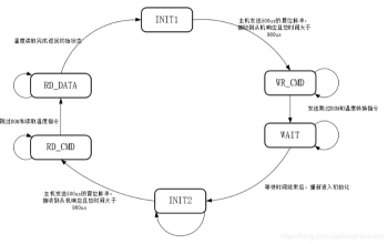 三段式狀態(tài)機(jī)的概念可以參考:狀態(tài)機(jī)(一段式、二段式、三段式)、摩爾型(Moore)和米勒型(Mealy)當(dāng)知道了 DS18B20 的控制流程之后,我們可以借助狀態(tài)機(jī)來進(jìn)一步了解它是如何跳轉(zhuǎn)的: