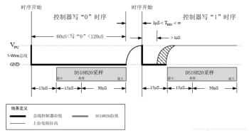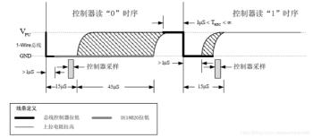 寫時(shí)隙主設(shè)備通過寫時(shí)隙將命令寫入 DS18B20 中,寫時(shí)隙有兩種情況:寫“1”和寫“0”時(shí) 隙。主設(shè)備通過寫 1 時(shí)隙來向 DS18B20 中寫入邏輯 1,通過寫 0 時(shí)隙來向 DS18B20 中寫入 邏輯 0。當(dāng)主設(shè)備將總線從高電平拉至低電平時(shí),啟動(dòng)寫時(shí)隙,所有的寫時(shí)隙持續(xù)時(shí)間最 少為 60us,每個(gè)寫時(shí)隙間的恢復(fù)時(shí)間最少為 1us。 當(dāng)總線(DQ)拉低后,DS18B20 在 15us 至 60us 之間對(duì)總線進(jìn)行采樣,如果采的 DQ 為高電平則發(fā)生寫 1,如果為低電平則發(fā)生寫 0,如下圖所示(圖中的總線控制器即為主設(shè)備)。 如果要產(chǎn)生寫 1 時(shí)隙,必須先將總線拉至邏輯低電平然后釋放總線,允許總線在寫 隙開始后 15us 內(nèi)上拉至高電平。若要產(chǎn)生寫 0 時(shí)隙,必須將總線拉至邏輯低電平并保持不 變最少 60us。