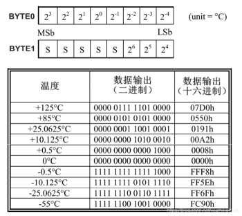 由上圖可知DS18B20的高速緩存器共有9個(gè)8位寄存器,其中溫度數(shù)據(jù)低位(LSB)對(duì)應(yīng)字節(jié) 地址0,溫度數(shù)據(jù)高位(MSB)對(duì)應(yīng)字節(jié)地址1,以此類推,配置寄存器的字節(jié)地址為4。溫度數(shù)據(jù)存放的格式如下圖: