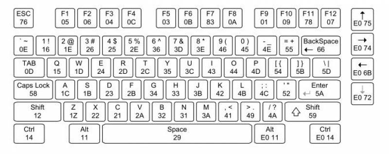組合按鍵的掃描碼發(fā)送按照按鍵發(fā)生的次序,如以下面順序按左SHIFT+A鍵:1按下左SHIFT鍵,2按下A鍵,3釋放A鍵,4釋放左SHIFT鍵,那么計算機(jī)上接收到的一串?dāng)?shù)據(jù)為0x12 0x1C 0xF0 0x1C 0xF0 0x12。在驅(qū)動程序設(shè)計中,就是根據(jù)這樣的分類來對不同的按鍵進(jìn)行不同處理的,當(dāng)前簡單程序只支持第一類按鍵的操作。鍵盤中不同按鍵的編碼如下: