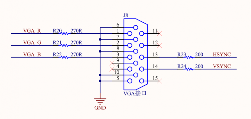 三色信號都是模擬信號,行場同步信號都是數(shù)字信號;對于VGA的接口模擬電壓,為0~0.714V,0代表無色,0.714代表滿色,F(xiàn)PGA輸出3.3V,所以還必須要經(jīng)過DAC的轉(zhuǎn)換?,F(xiàn)今有兩種比較成熟的方法:電阻分壓方式和DAC轉(zhuǎn)換方式。我們的底板上就是采用的電阻分壓的方式,因VGA顯示器端有75歐的下拉電阻,為了得到0.714V的電壓我們給RGB信號線上串入270歐的電阻,3.3V*75/(270+75)=0.717V。如下
