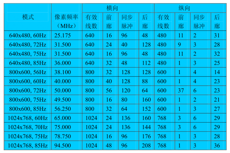 //-------------------------------------------------------------------- //>>>>>>>>>>>>>>>>>>>>>>>>>COPYRIGHTNOTICE<<<<<<<<<<<<<<<<<<<<<<<<< //-------------------------------------------------------------------- //Module:Param_define // //Author:Step // //Description:Param_define // //-------------------------------------------------------------------- //CodeRevisionHistory: //-------------------------------------------------------------------- //Version:|Mod.Date:|ChangesMade: //V1.1|2016/10/30|Initialver //-------------------------------------------------------------------- `timescale1ns/1ns //VGA顯示器驅(qū)動只需要5個信號即可(行同步、場同步、紅色、綠色、藍色信號) //紅綠藍三色信號為模擬信號,輸入電壓范圍為0.0V~0.7V //VGA時序中行同步和場同步都分為四個階段(同步脈沖、后廊、有效線數(shù)、前廊) //VGA顯示有很多模式,每種模式都是有固定的時鐘和時序參數(shù),需要根據(jù)要求控制 `ifdefVGA_800X600_60Hz //不同VGA顯示模式相應(yīng)的參數(shù) //--------------------------------------------------------------------------- //--Horizonaltiminginformation`defineHSYNC_A16'd128 //128`defineHSYNC_B16'd216 //128+88 `defineHSYNC_C16'd1016 //128+88+800`defineHSYNC_D16'd1056 //128+88+800+40 //行同步脈沖+后廊+有效線數(shù)+前廊 //--Verticaltiminginformation`defineVSYNC_O16'd4 //4`defineVSYNC_P16'd27 //4+23`defineVSYNC_Q16'd627 //4+23+600`defineVSYNC_R16'd628 //4+23+600+1//場同步脈沖+后廊+有效線數(shù)+前廊 //--------------------------------------------------------------------------- `endif`ifdefVGA_640X480_85Hz //不同VGA顯示模式相應(yīng)的參數(shù) //--------------------------------------------------------------------------- //--Horizonaltiminginformation`defineHSYNC_A16'd48 //48`defineHSYNC_B16'd160 //48+112`defineHSYNC_C16'd800 //48+112+640`defineHSYNC_D16'd832 //48+112+640+32 //行同步脈沖+后廊+有效線數(shù)+前廊 //--Verticaltiminginformation`defineVSYNC_O16'd3 //3`defineVSYNC_P16'd28 //3+25`defineVSYNC_Q16'd508 //3+25+480`defineVSYNC_R16'd509 //3+25+480+1 //場同步脈沖+后廊+有效線數(shù)+前廊 //--------------------------------------------------------------------------- `endif