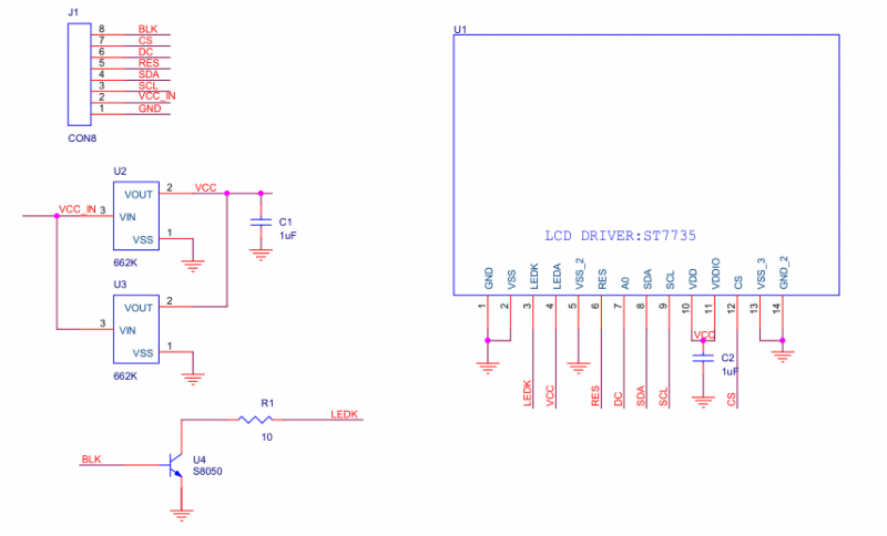 原理圖中的器件U1為液晶屏,液晶屏為1.8寸,128RGB160像素,串行總線(SPI),液晶屏集成了ST7735S的驅(qū)動器,處理器與ST7735S通信完成液晶屏的顯示控制